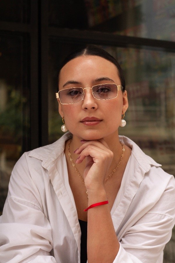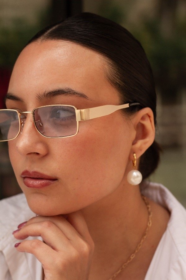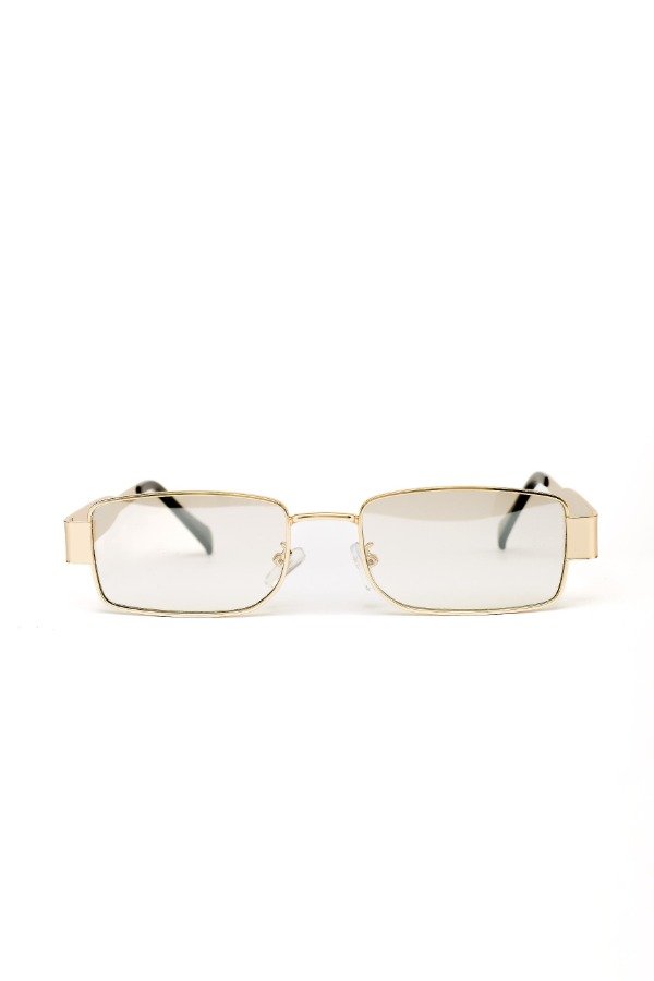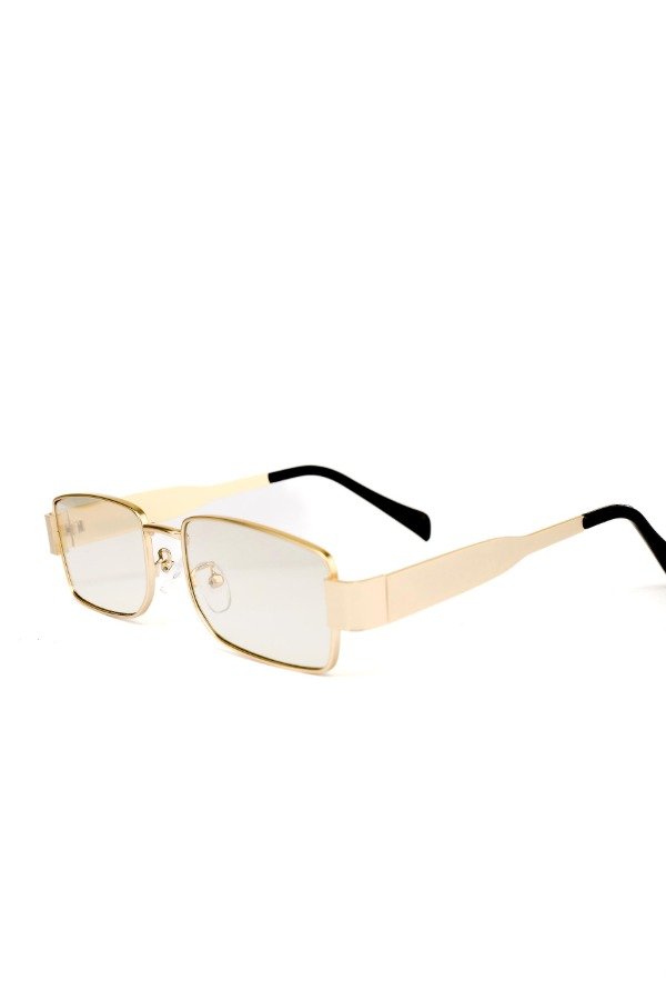 Anteojos de sol fabricados en metal ultra resistente con marco dorado y cristales orgánicos transparentes. Con detalle colgante en el cristal. Con protección UV400 y bisagras metálicas. Medidas: Alto: 3,5 cm Ancho: 15 cm Profundidad: 14 cm