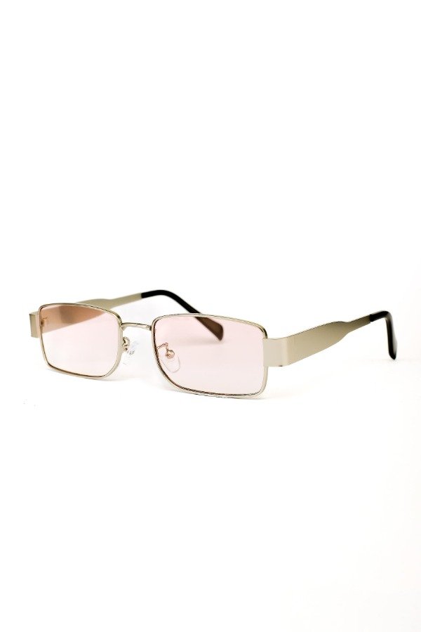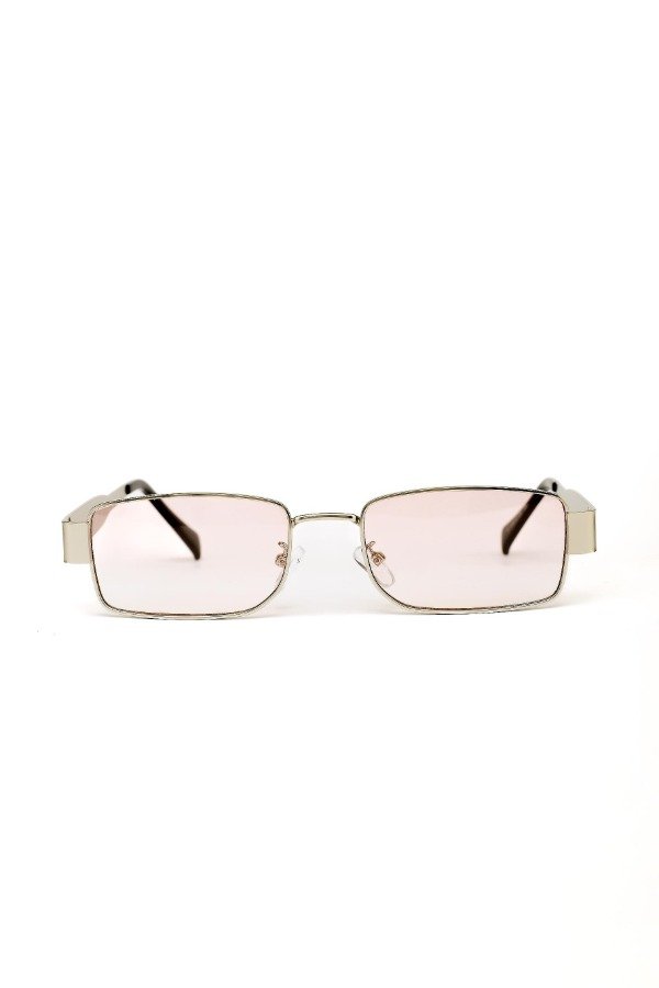 Anteojos de sol fabricados en metal ultra resistente con marco dorado y cristales orgánicos rosas. Con detalle colgante en el cristal. Con protección UV400 y bisagras metálicas.