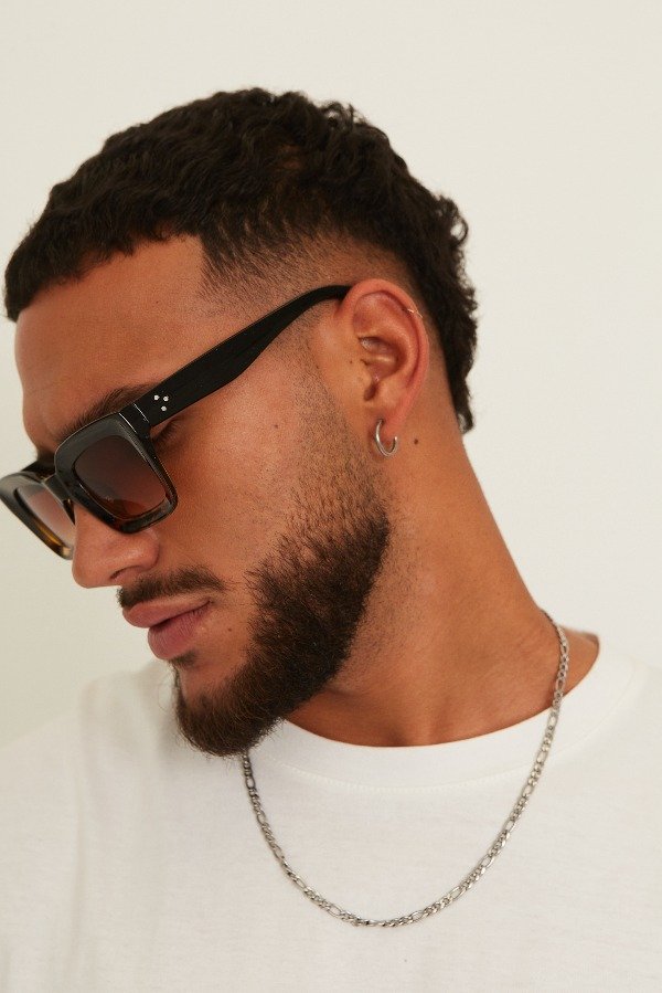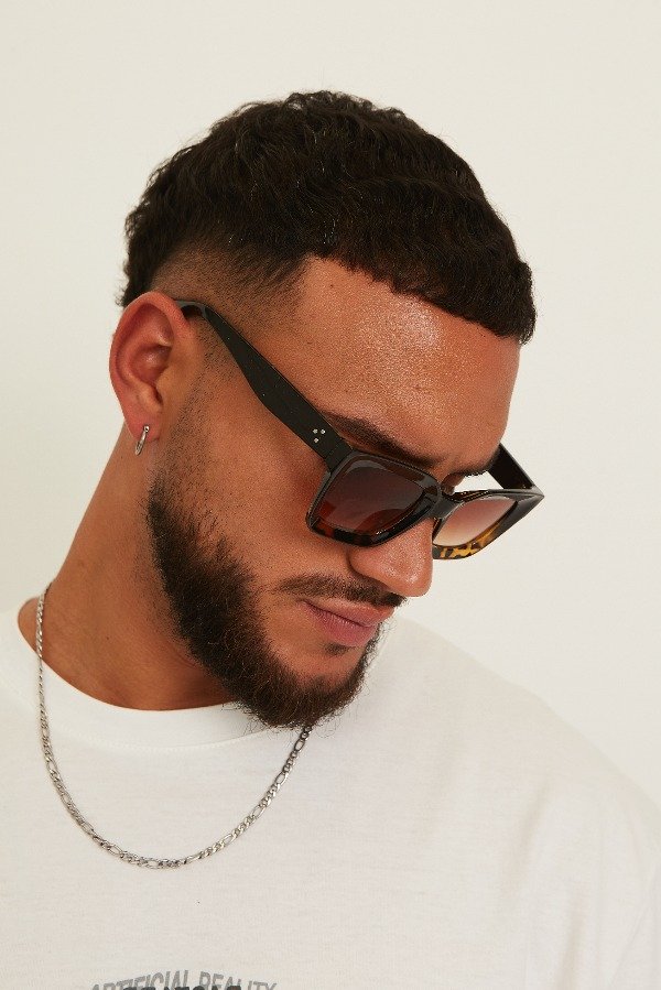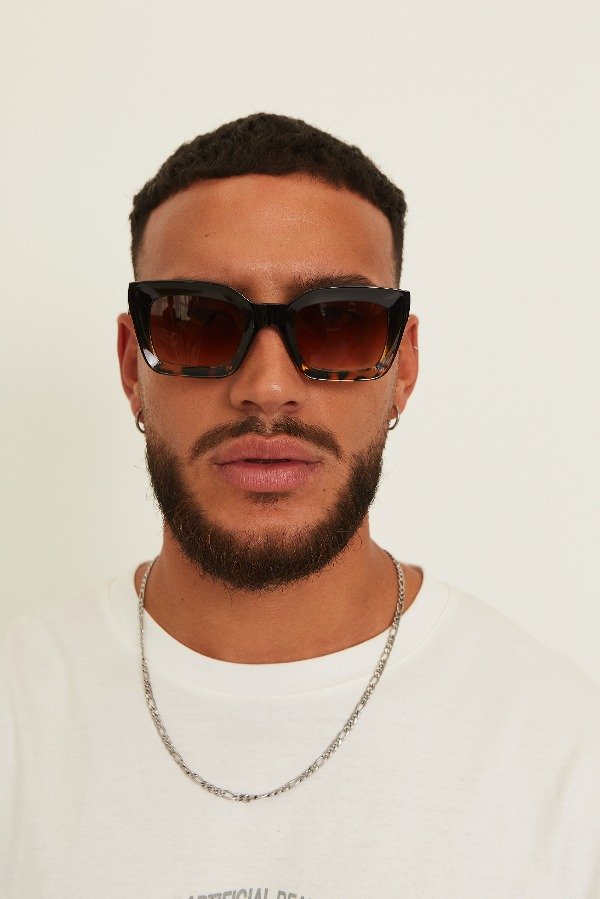Anteojos de sol fabricados en policarbonato ultra resistente con marco carey y negro y cristales orgánicos marrones. Con bisagras metálicas y protección UV400.