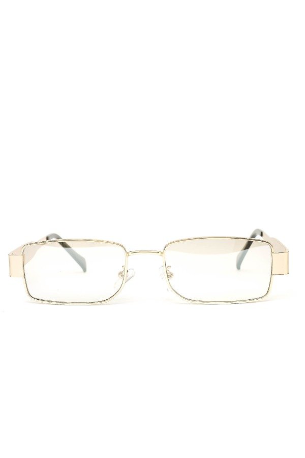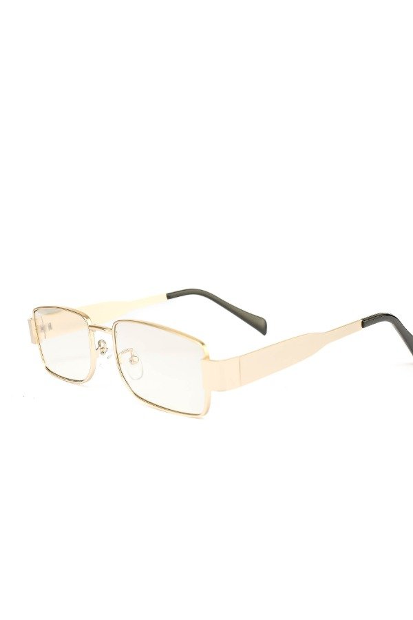 Anteojos de sol fabricados en metal ultra resistente con marco dorado y cristales orgánicos transparentes. Con detalle colgante en el cristal. Con protección UV400 y bisagras metálicas. Medidas: Alto: 3,5 cm Ancho: 15 cm Profundidad: 14 cm