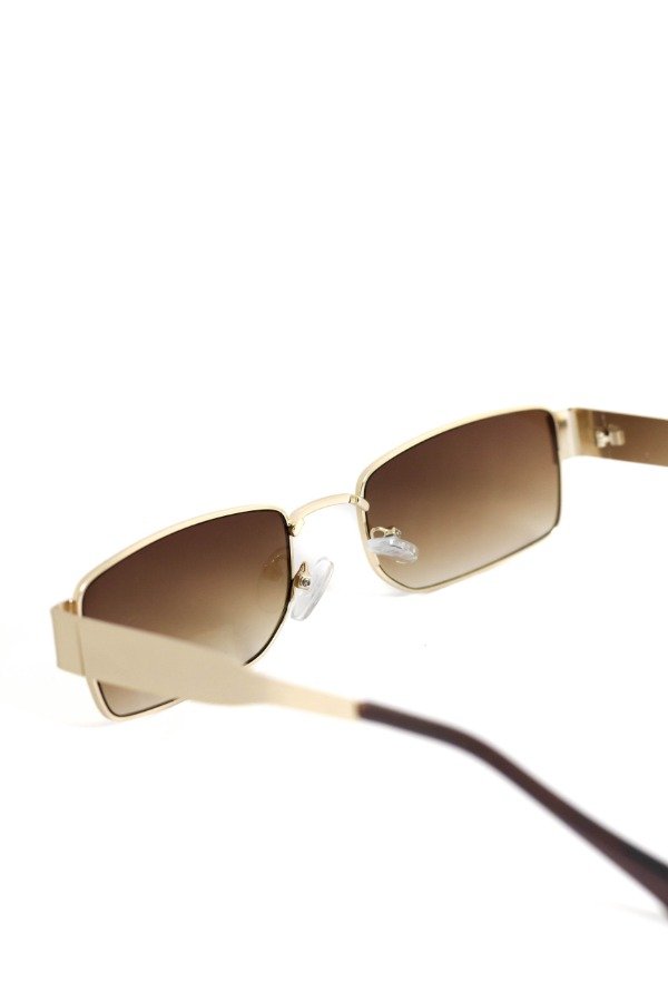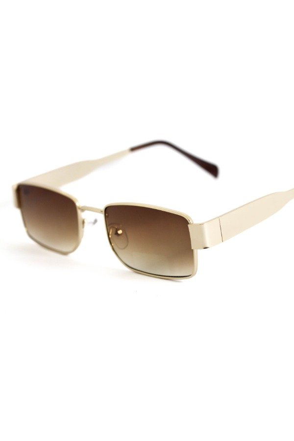 Anteojos de sol fabricados en metal ultra resistente con marco dorado y cristales orgánicos marrones. Con detalle colgante en el cristal. Con protección UV400 y bisagras metálicas. Medidas: Alto: 3,5 cm Ancho: 15 cm Profundidad: 14 cm