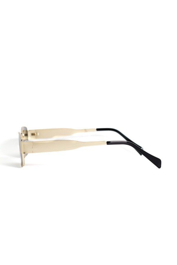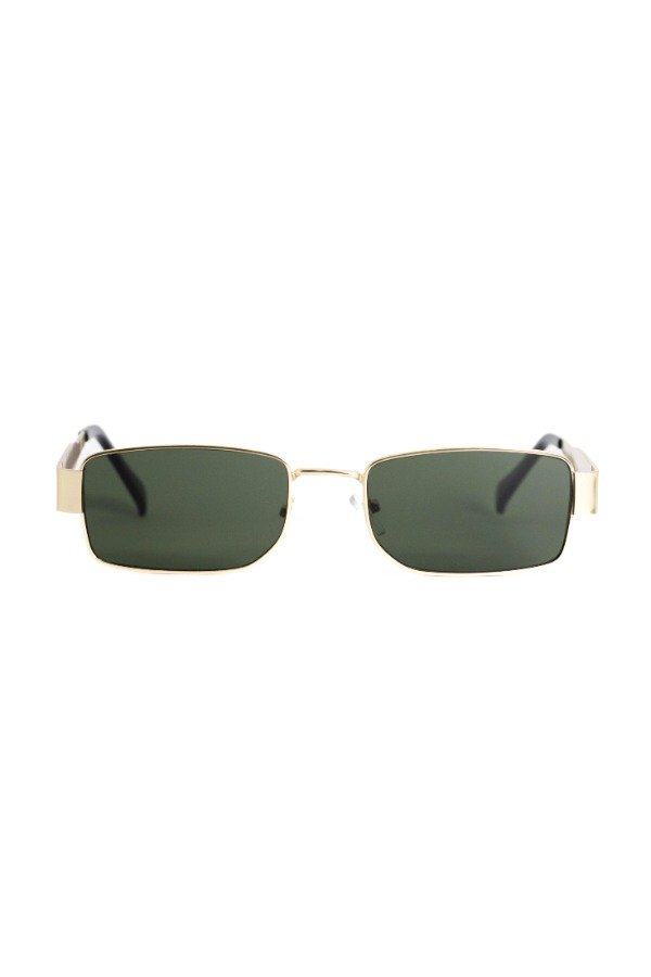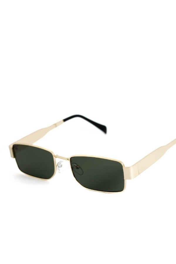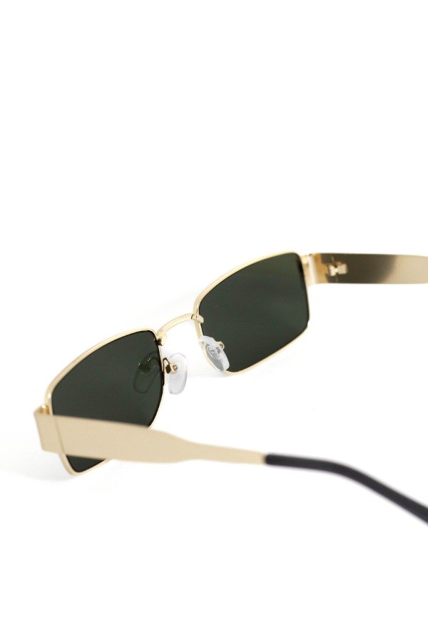 Anteojos de sol fabricados en metal ultra resistente con marco dorado y cristales orgánicos verdes. Con detalle colgante en el cristal. Con protección UV400 y bisagras metálicas. Medidas: Alto: 3,5 cm Ancho: 15 cm Profundidad: 14 cm