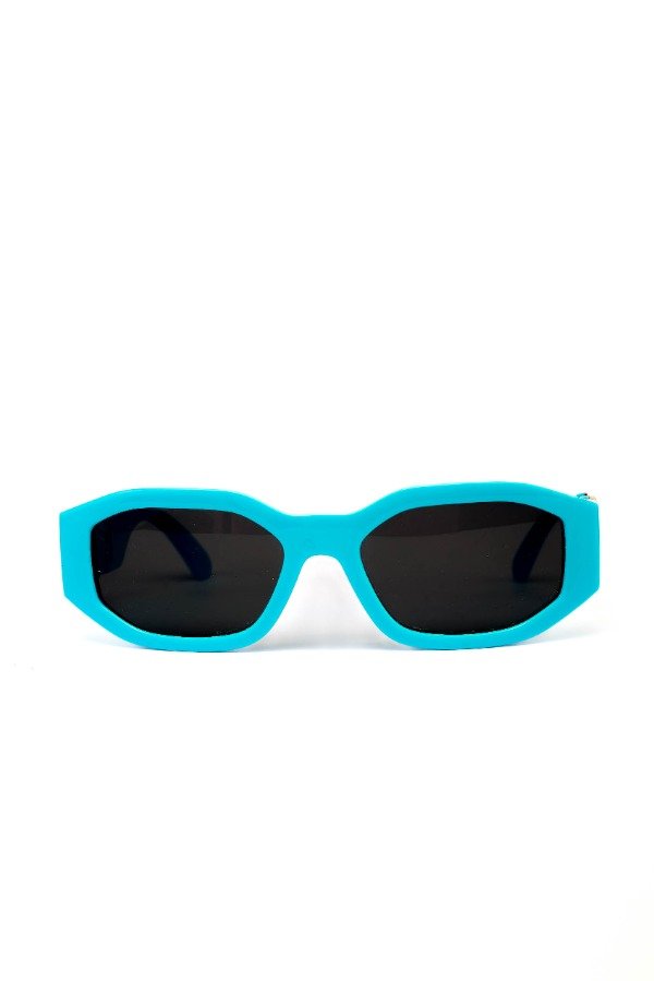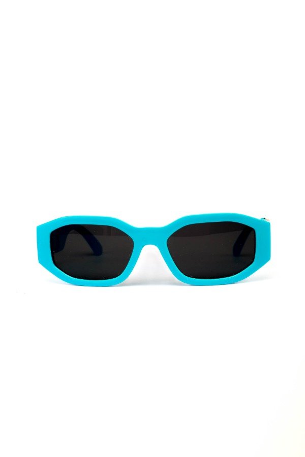 Anteojos de sol fabricados en acetato resistente con marco azul con cristales orgánicos negros. Con protección UV400. Detalle de logo Versace metalizado al costado.