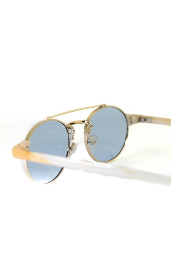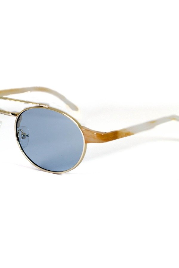 Anteojos de sol fabricados en metal ultra resistente con marco dorado y cristales orgánicos celestes. Con detalle colgante en el cristal. Con protección UV400 y bisagras metálicas. Medidas: Alto: 4 cm Ancho: 14 cm Profundidad: 15 cm