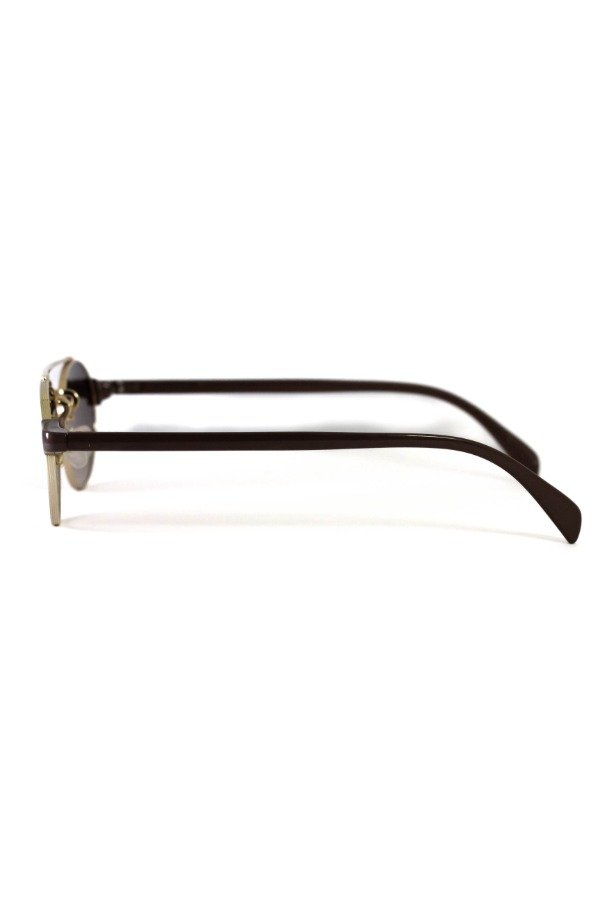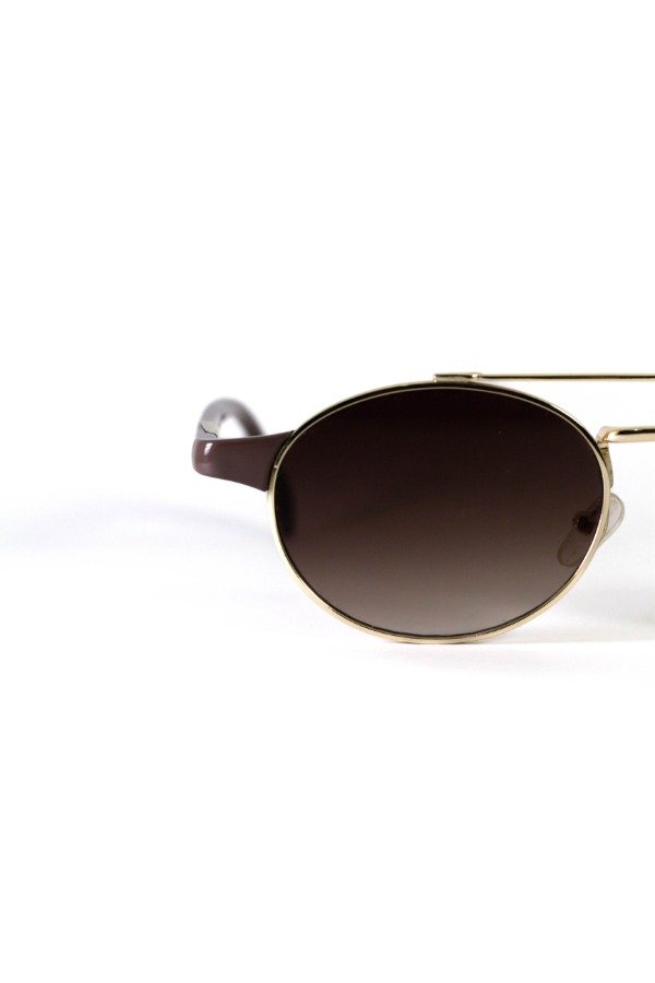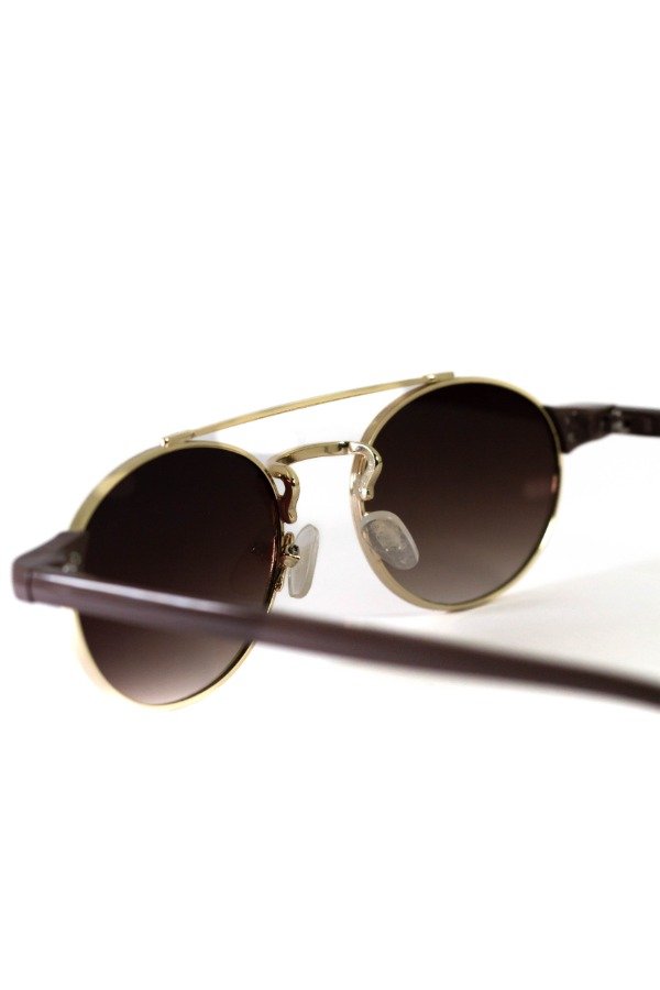 Anteojos de sol fabricados en metal ultra resistente con marco dorado y cristales orgánicos marrones. Con detalle colgante en el cristal. Con protección UV400 y bisagras metálicas. Medidas: Alto: 4 cm Ancho: 14 cm Profundidad: 15 cm
