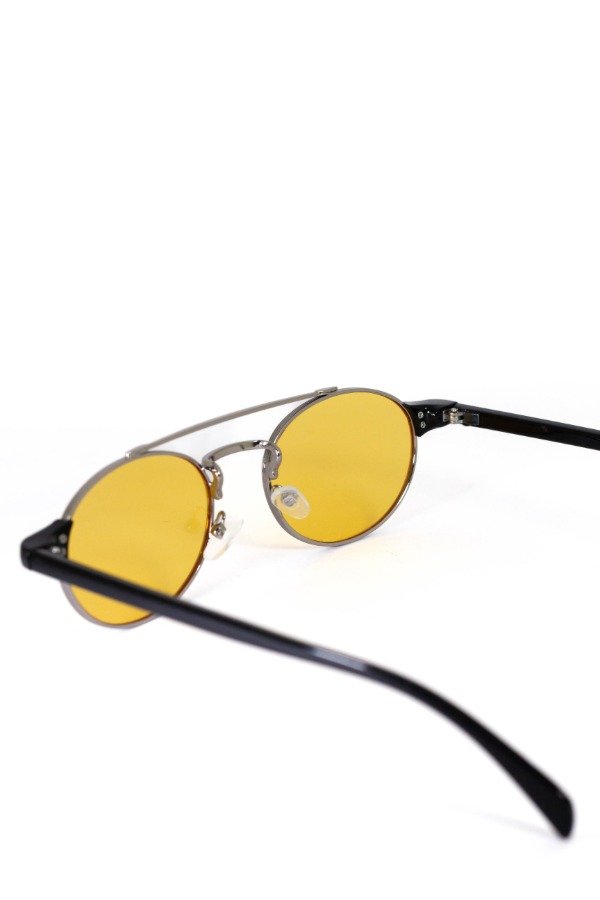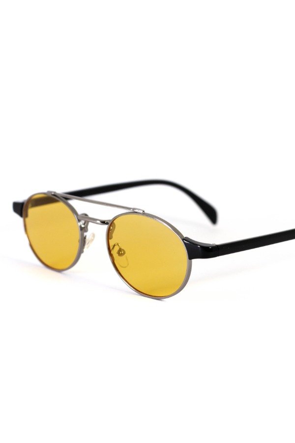 Anteojos de sol fabricados en metal ultra resistente con marco plateados y cristales orgánicos amarillos. Con detalle colgante en el cristal. Con protección UV400 y bisagras metálicas. Medidas: Alto: 4 cm Ancho: 14 cm Profundidad: 15 cm